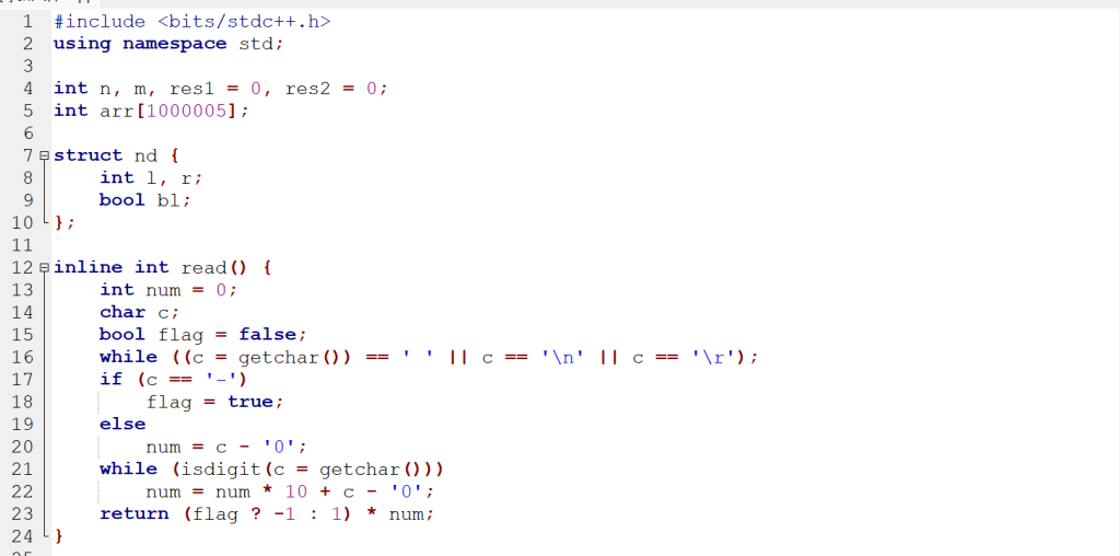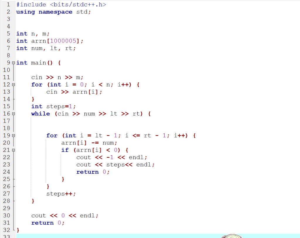 分析了一下超时的原因:时间复杂度是O(n*m) 当n m都是题目中的最大值10^6时,总的处理次数为10^12,时间限制1s,远大于一秒处理次数10^8。