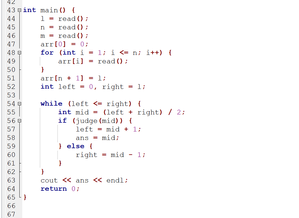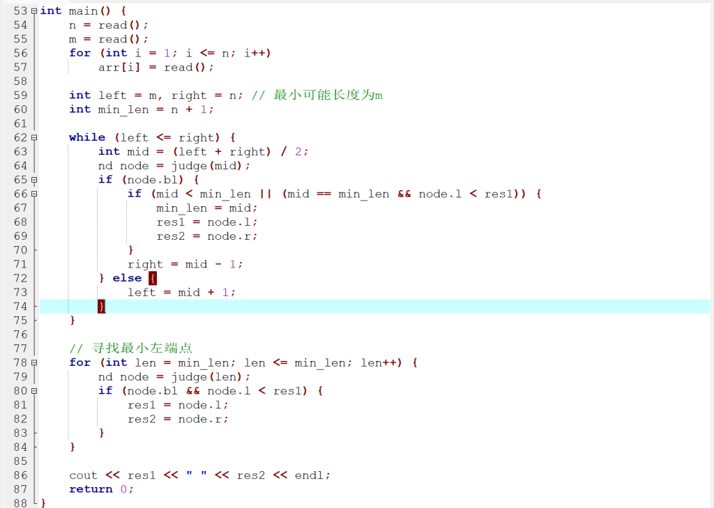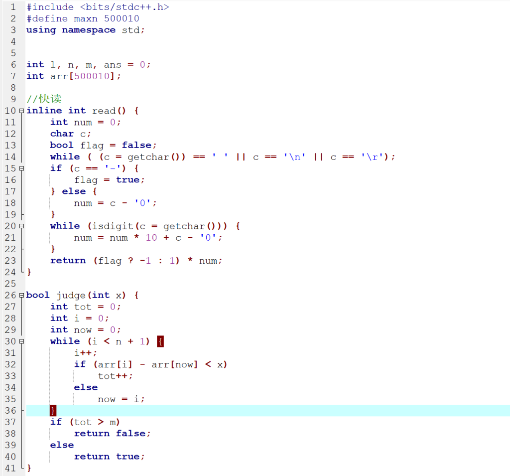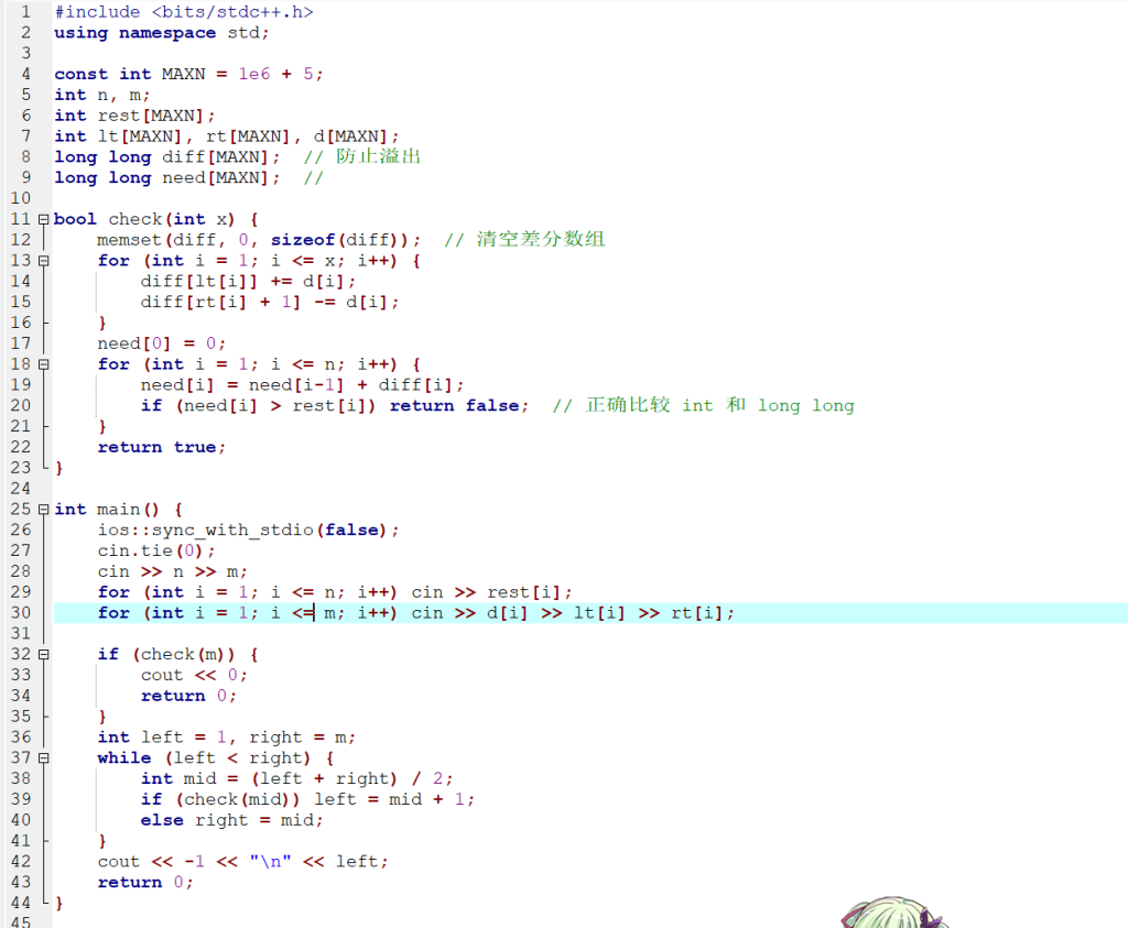 因此可以考虑用差分的方法来判断第i个请求是否满足,时间复杂度仅为O(n+m),并且最后用一个二分查找来判断到哪一个之前满足,总的时间复杂度为O( [log(m)] * (n+m) ) 当m很大时,时间复杂度显著降低。下面是更新后的代码: